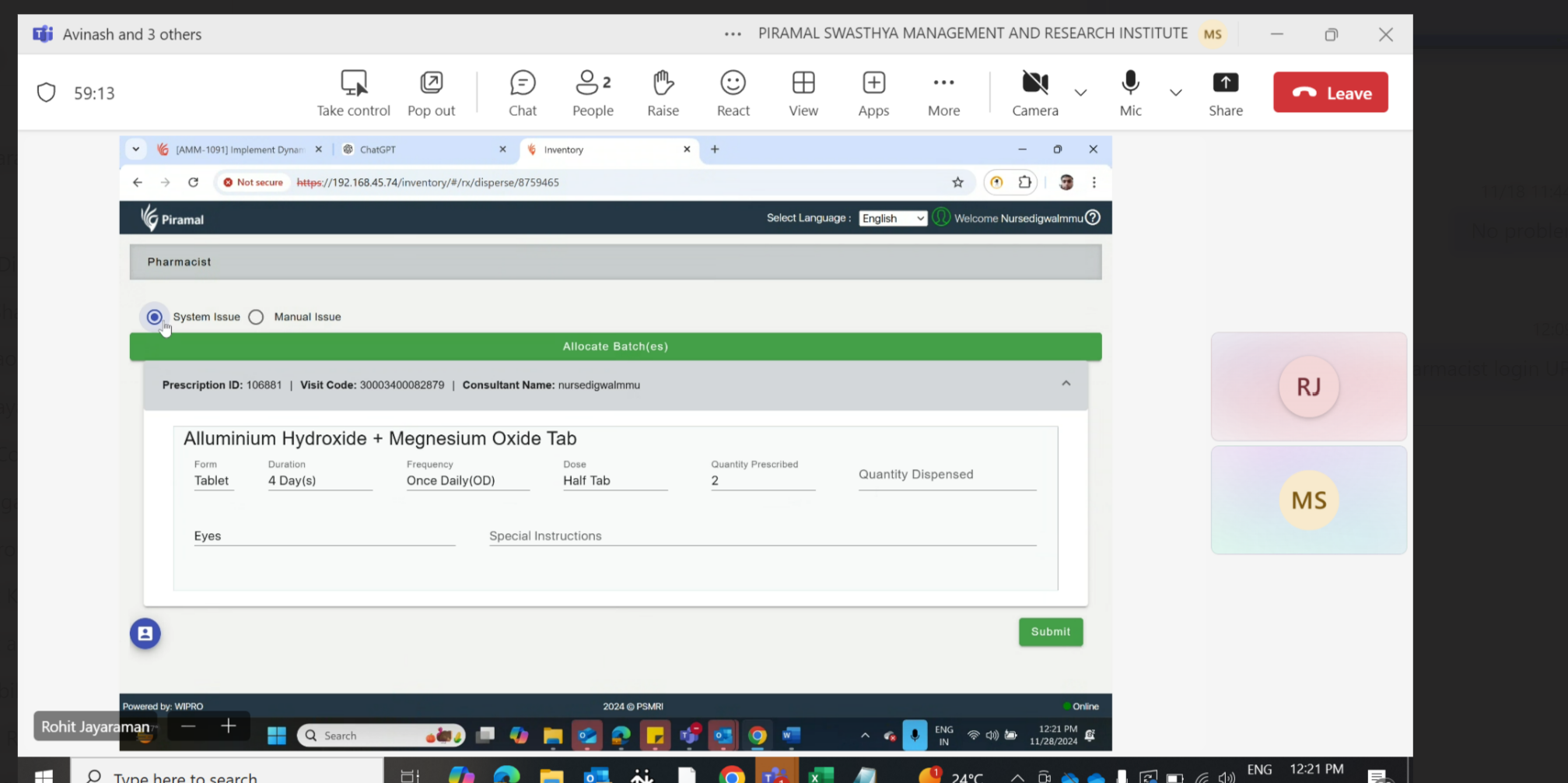 In the Pharmacist login, when switching between the two modules—System Issue and Manual Issue (presented as radio buttons), there is an issue where the "Allocate Batches" section briefly appears and disappears within a fraction of a second. This quick display and disappearance disrupt the user experience and should be addressed.