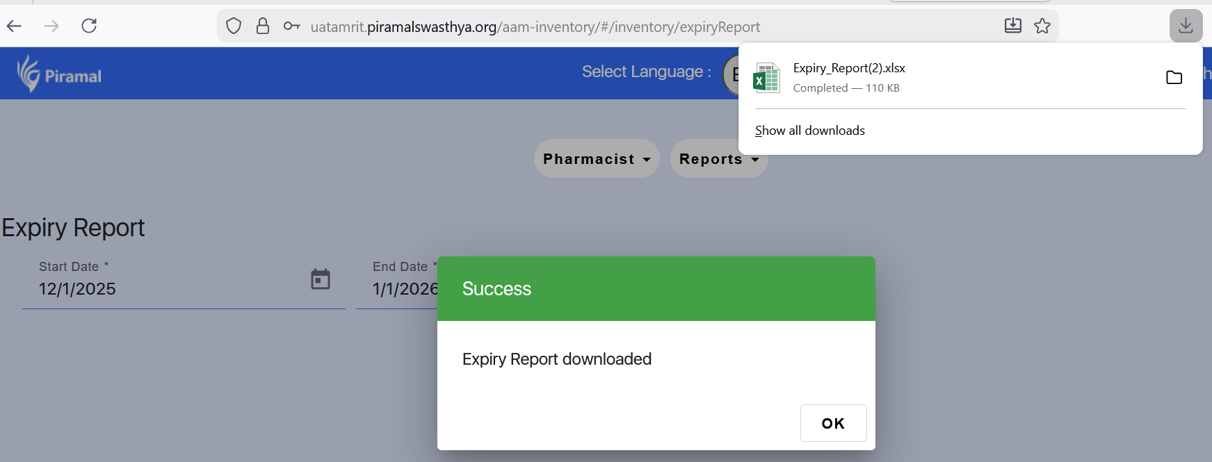 AMM-1937 Expiry Report – Error while downloading expiry report in MMU/TM/HWC