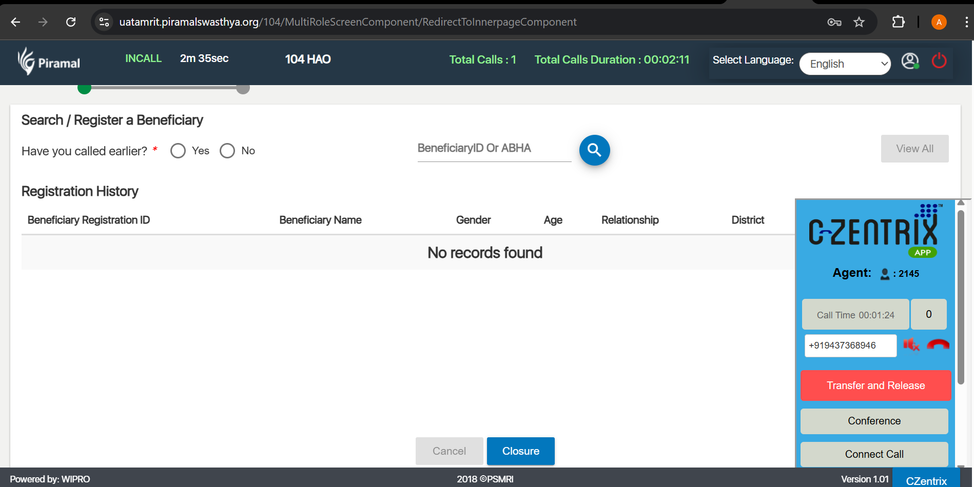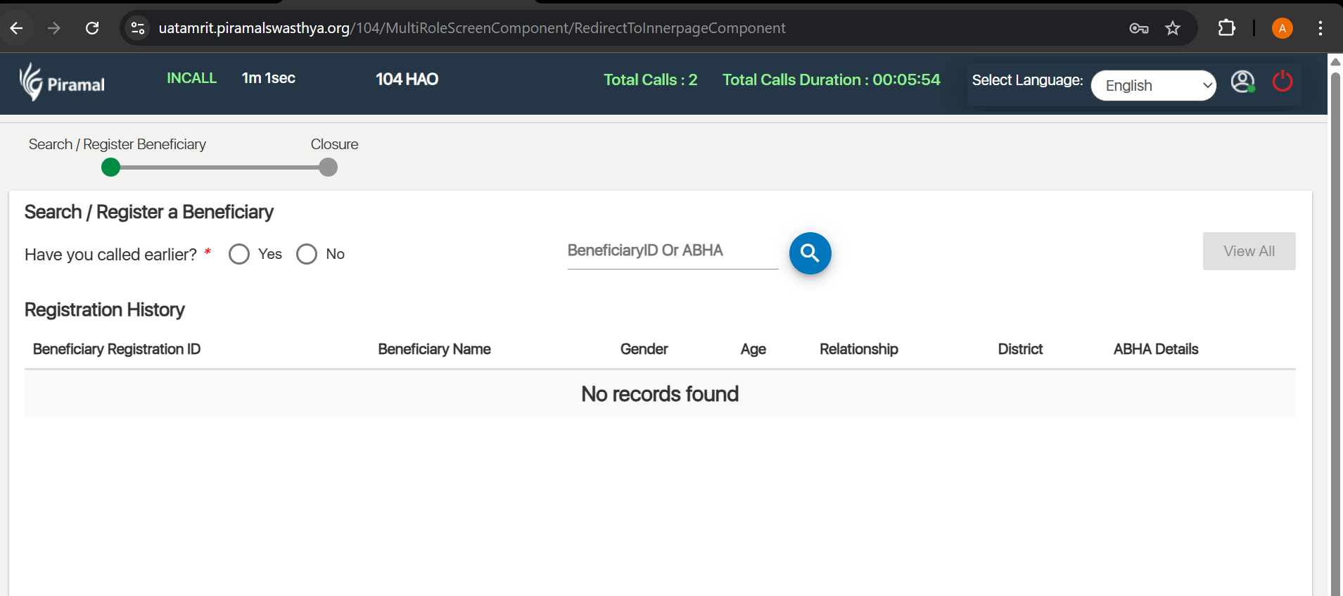 In UAT/Wprdev 104 application registered beneficiary history is not visible once call landed.