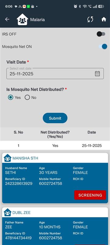 - Below the form, show a table with the history of mosquito net distribution (up to last 1 year only)