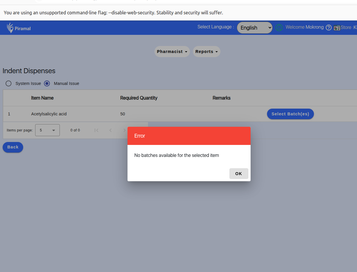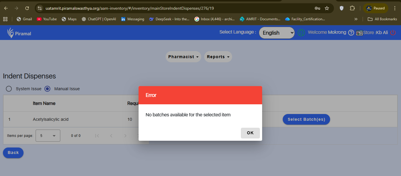 In the Indent section of the Inventory module, after the user approves the batch, the batch details do not display on the screen. Due to this missing batch information, the indent cannot be saved, blocking the completion of the indent processing workflow.