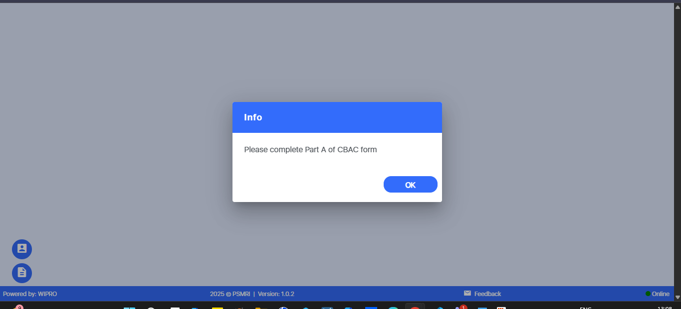 While filling the CBAC form, if the user attempts to proceed without completing Part A, a popup message is displayed stating “Please complete Part A of CBAC form”.