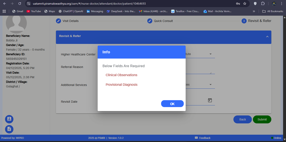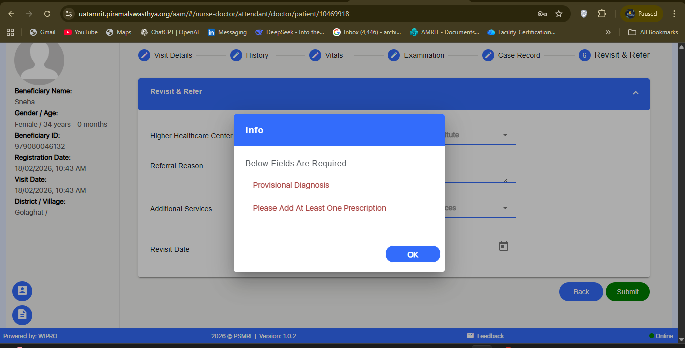 During form submission under the Doctor → Prescription section, the validation popup displays “Provisional Diagnosis” as a required field.