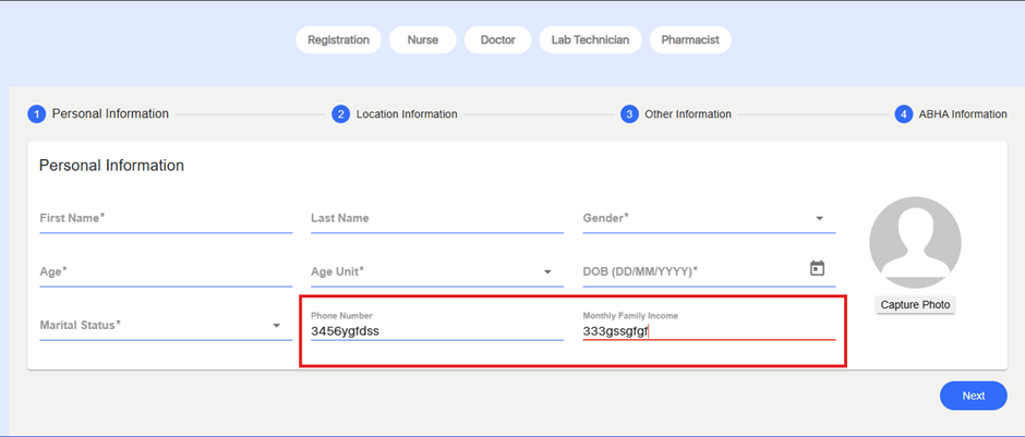 In the Registration module, fields such as Phone Number and Family Income are expected to accept numeric input only.
