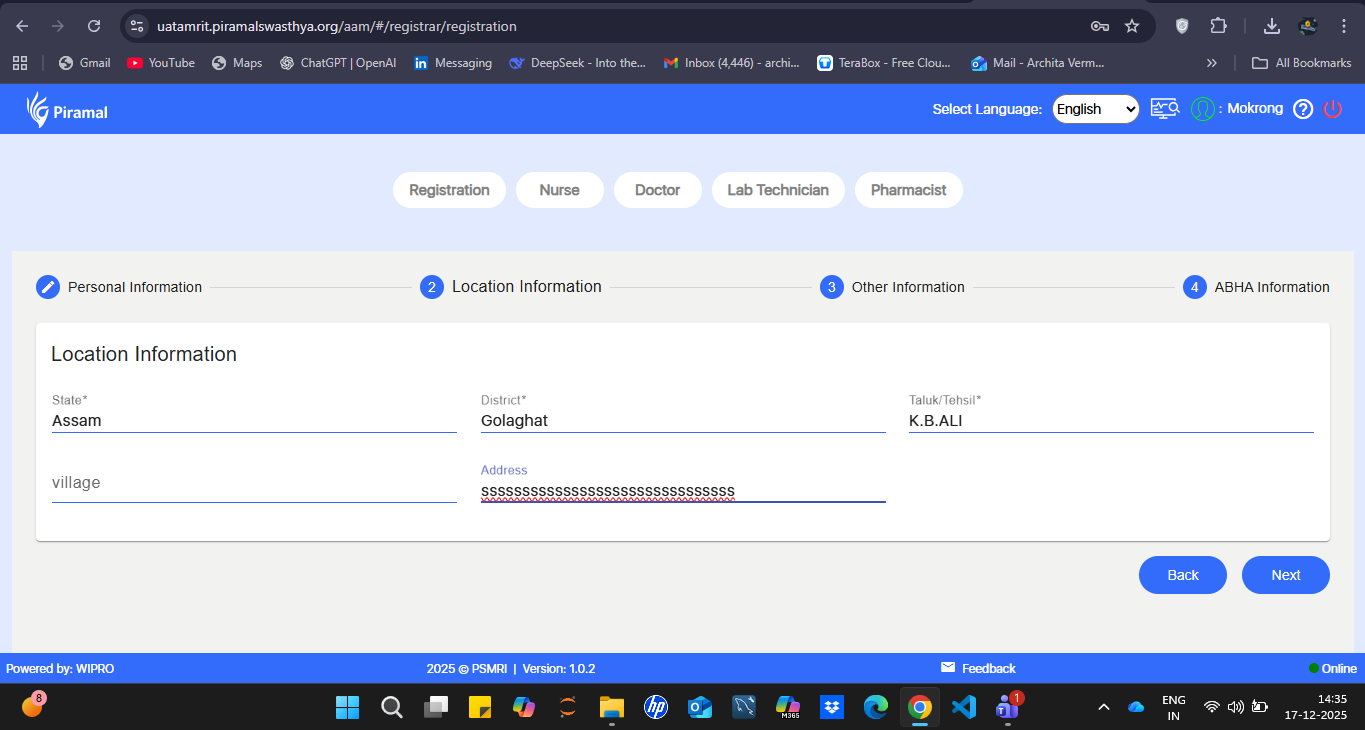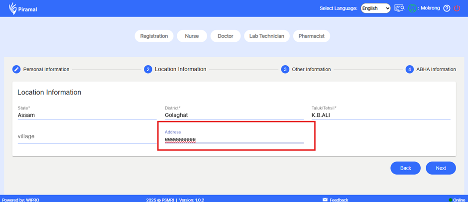 In the Registration form, the Address field is incorrectly limited to accepting only 10 characters. This prevents users from entering complete and valid address details. Address fields typically require longer input capacity to accommodate house numbers, street names, locality information, etc.