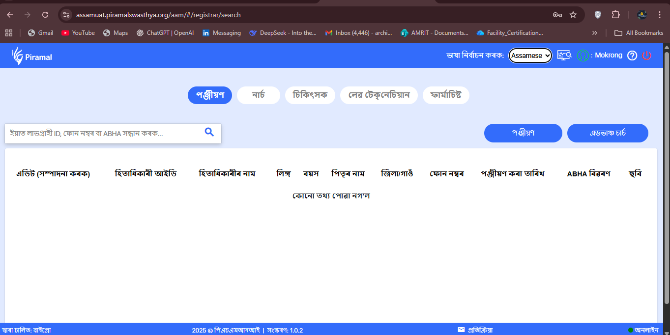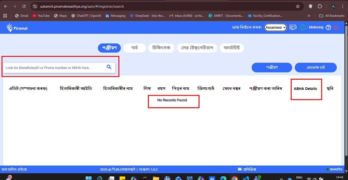 When the application language is switched to Assamese, several field labels under the Registration page are still displayed in English.