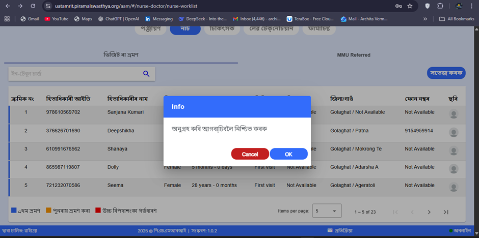 In the Nurse → Worklist page, when the application language is set to Assamese, clicking on any beneficiary opens a confirmation popup.