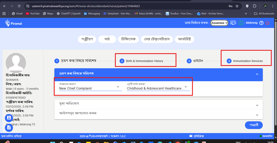 In the Nurse → Visit Details page, when the application language is set to Assamese, several UI components continue to display text in English.