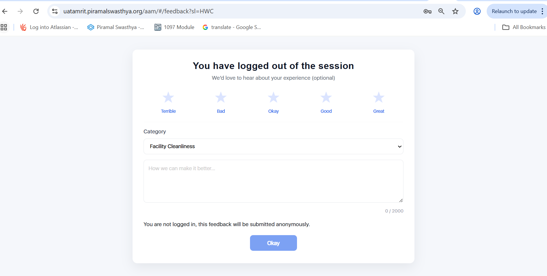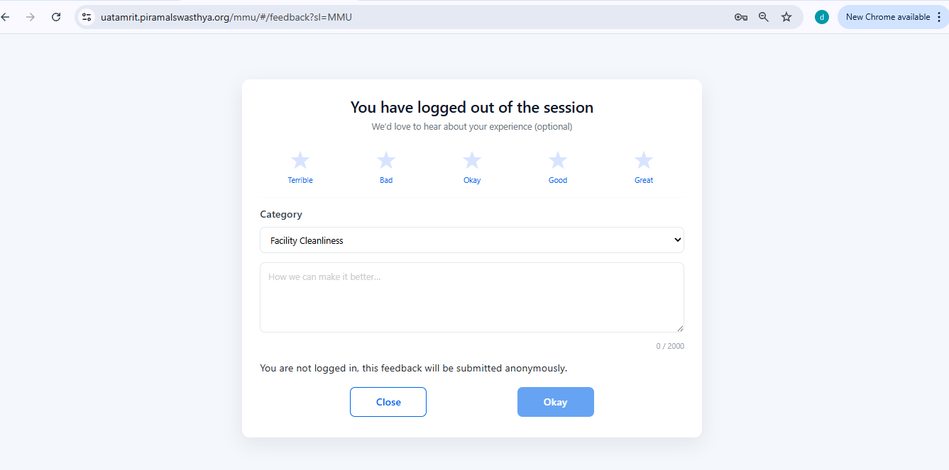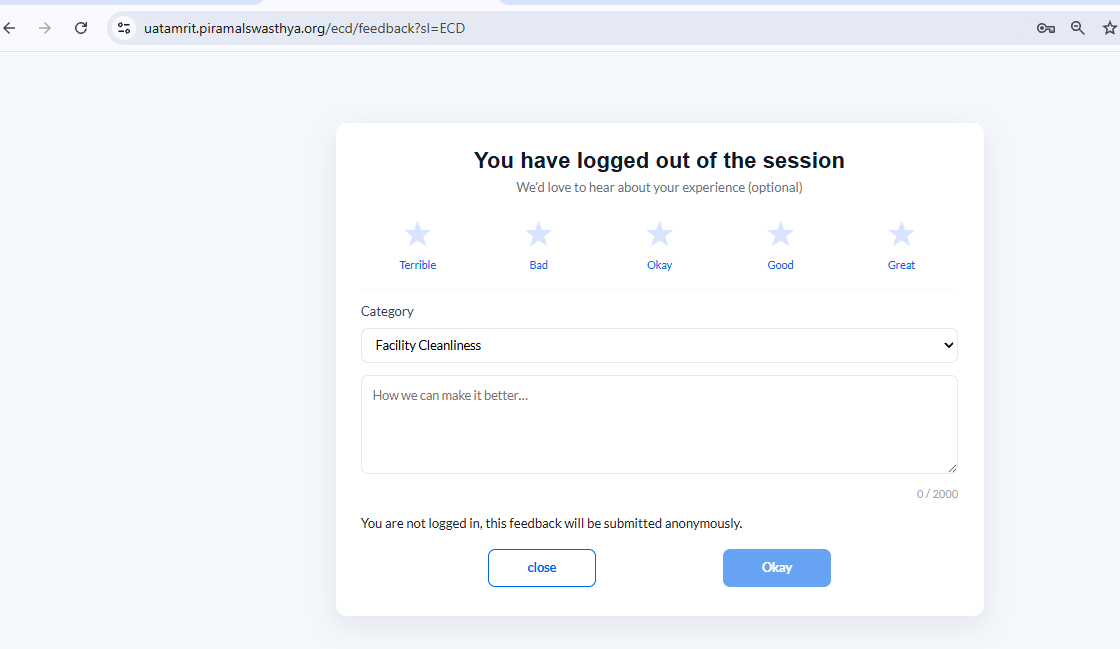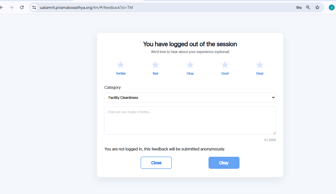 The feedback collection feature is working well; however, the screen currently does not display a Close button. This limits user control and affects overall usability. Please add a Close button to make the interface more intuitive and user-friendly.