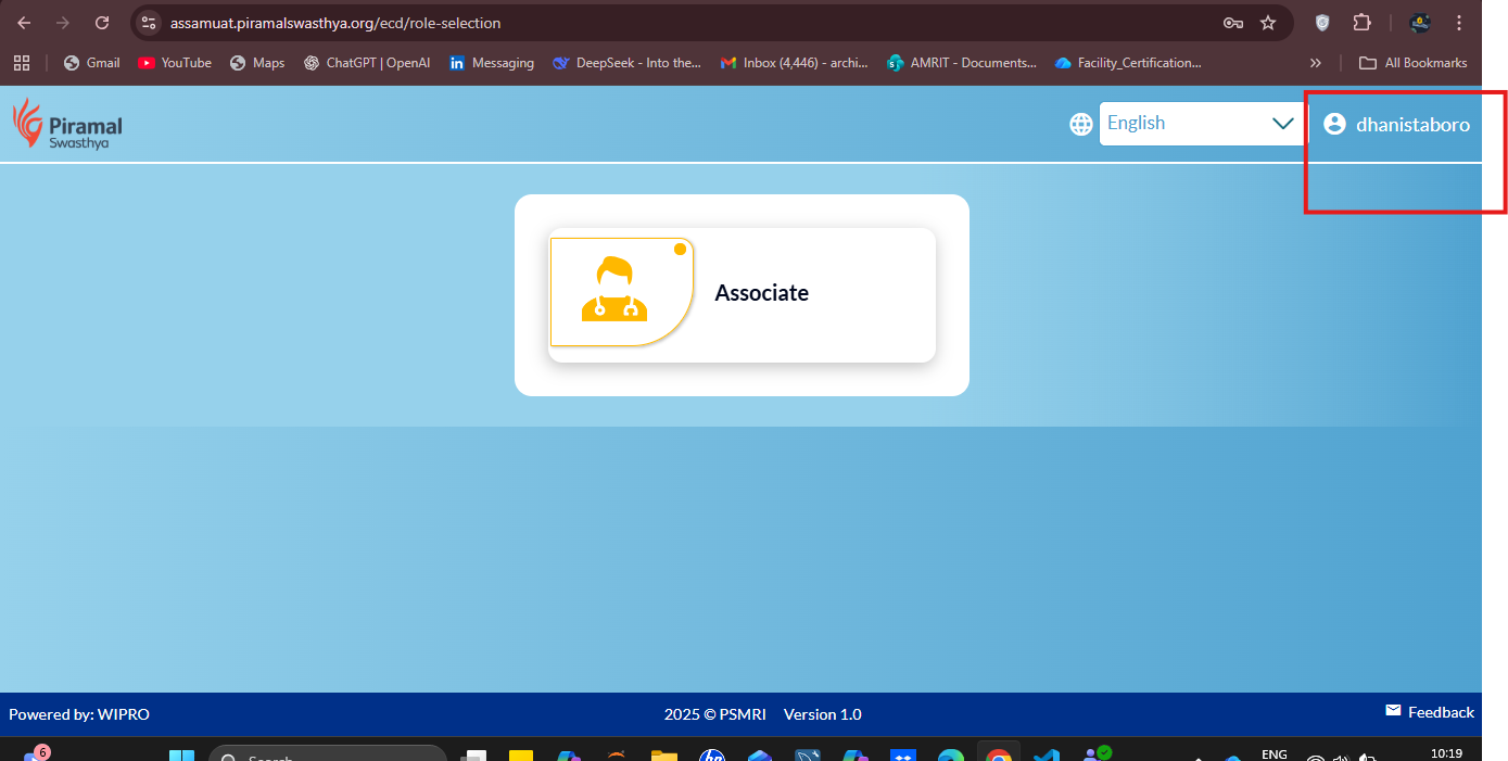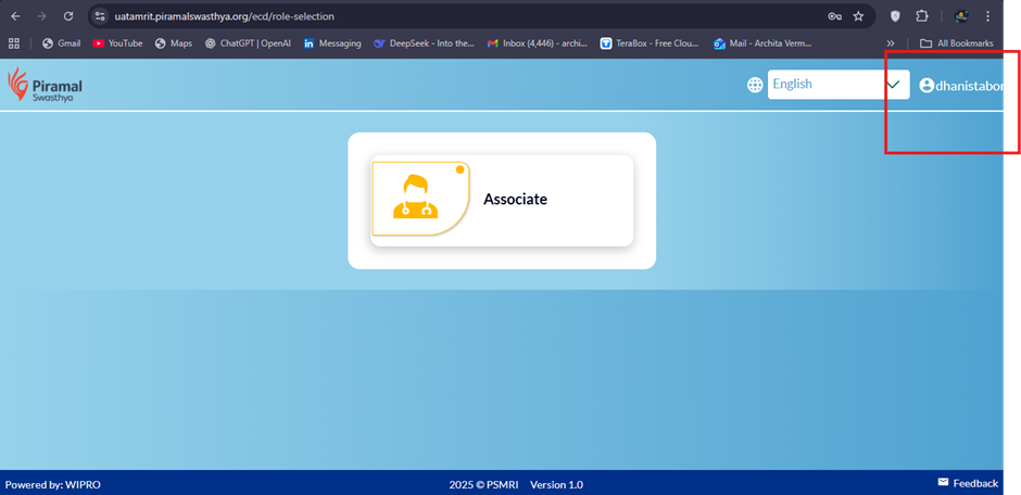 - Observe the username displayed on the top-right side of the header.