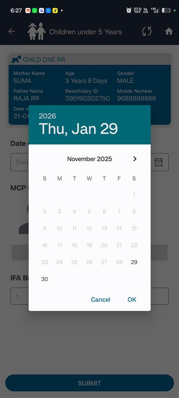 | Date of provision of IFA Bottle | Date picker | Allow date back up to 2 months from current month Allow monthly 1 visit (1 Bottle) Next visit date should be incremental Date of ‘next visit’ should not be less than ‘previous visit’ date (always should be greater than ‘previous visit’ date) |