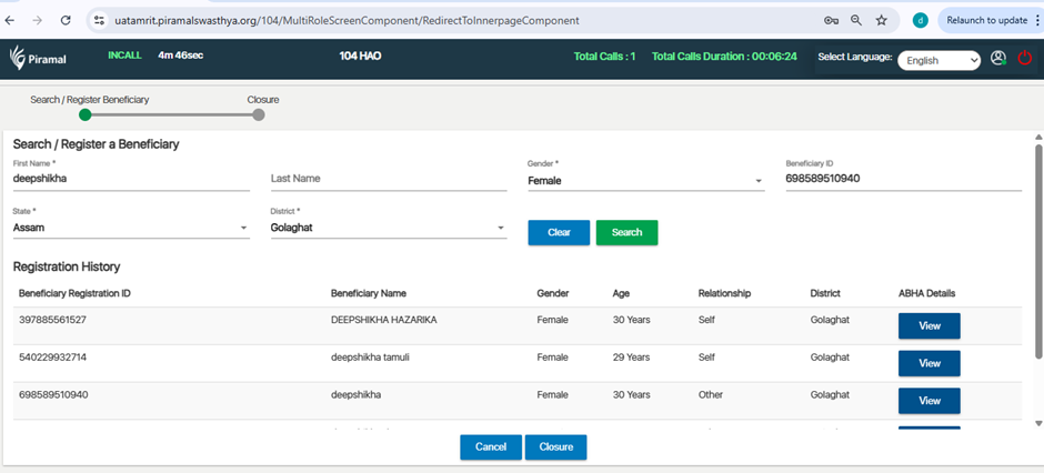 104: Unable to search beneficiary even after entering all mandatory details including Beneficiary ID