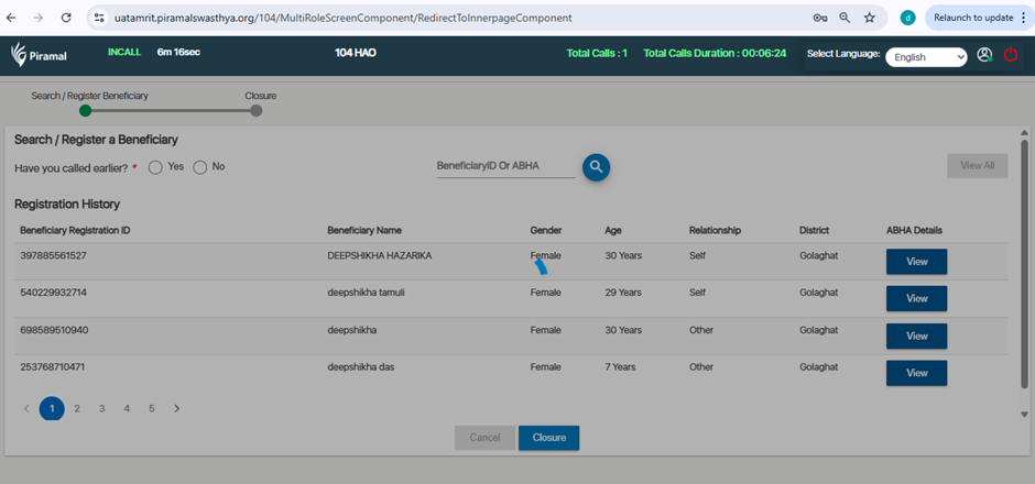 - On the call handling screen, select “Have you called earlier” = Yes.