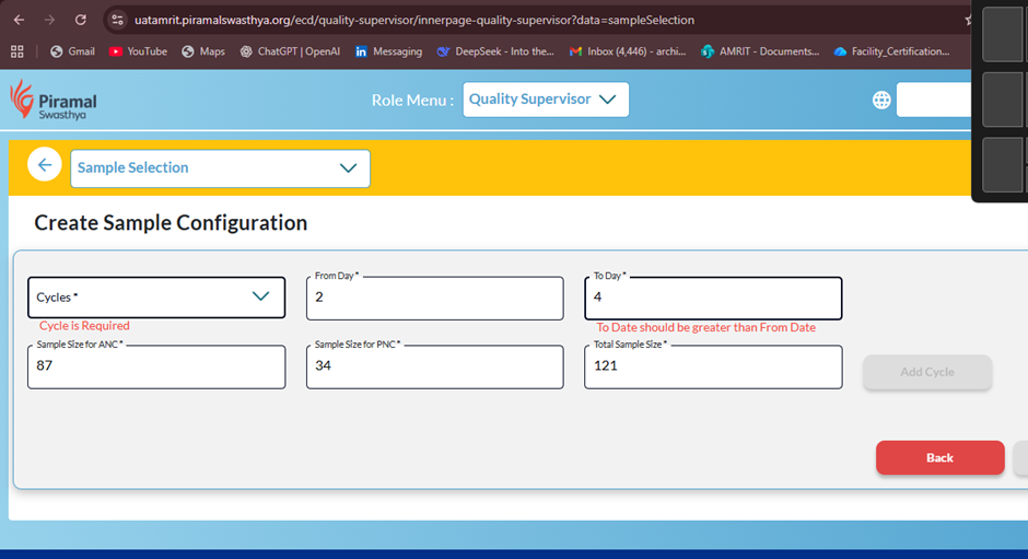 Under Quality Supervisor login, in the Sample Selection module, the Cycles dropdown under Create Sample Configuration section is not responding. On clicking the dropdown, no values are displayed and no selection can be made.