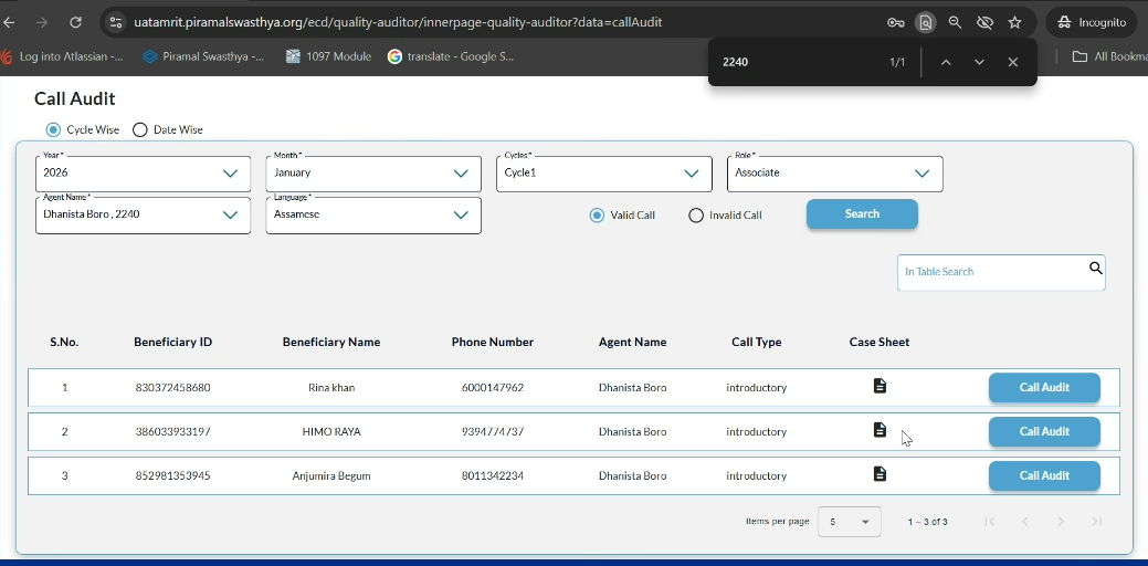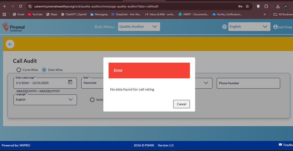 Under Quality Auditor login, in the Call Audit section, selecting any date range results in an error message “No data found”, even when data is expected to be available.