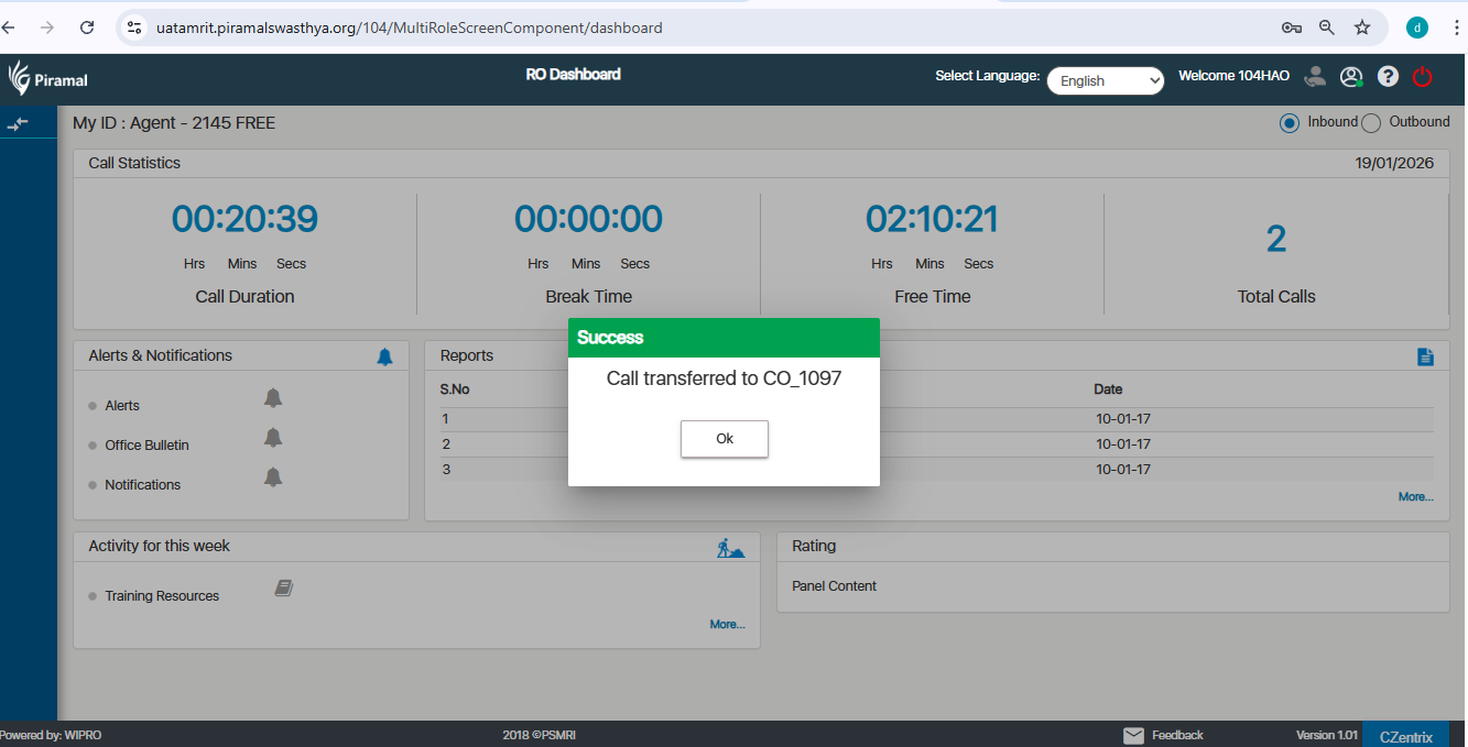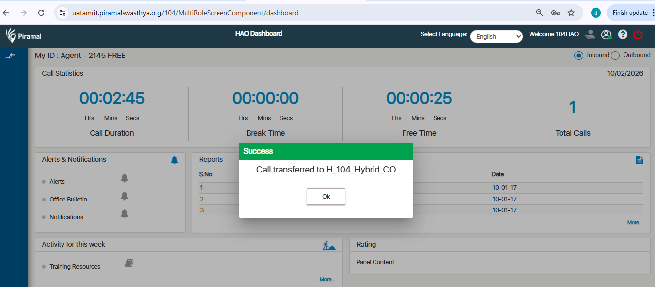 When a 104 HAO user attempts to transfer a call to 104 CO, the system shows a success message but routes the call to CO_1097.