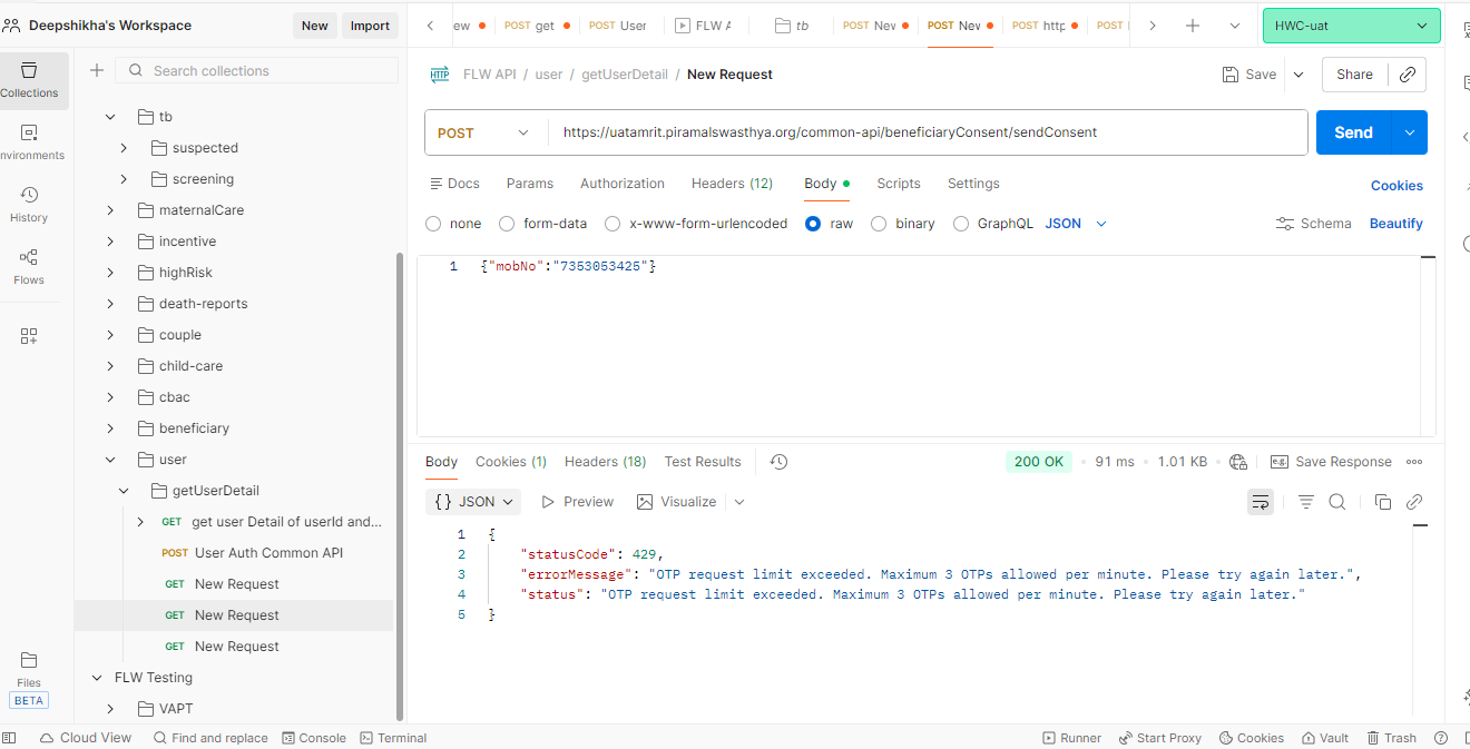 | https://uatamrit.piramalswasthya.org/common-api/beneficiaryConsent/sendConsent | OTP Flooding | CWE-799 | 6.5 | Medium | OTP (One-Time Password) flooding is a type of security vulnerability that occurs when an attacker attempts to send a large number of OTPs to a target user in a short period of time, in an attempt to overwhelm the user and prevent them from accessing their account. OTP is a security mechanism that is commonly used to verify the identity of users during the authentication process. When a user attempts to log in, a one-time code is sent to their registered phone number or email address. The user then enters this code to complete the authentication process. In an OTP flooding attack, the attacker sends a large number of OTPs to the target user's phone number or email address, causing their phone or inbox to become overwhelmed with messages. This can prevent the user from receiving the legitimate OTP necessary to access their account. |