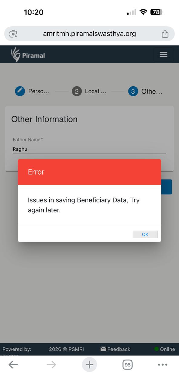 - While submitting, getting error "Issue in saving Beneficiary Data" Try again later